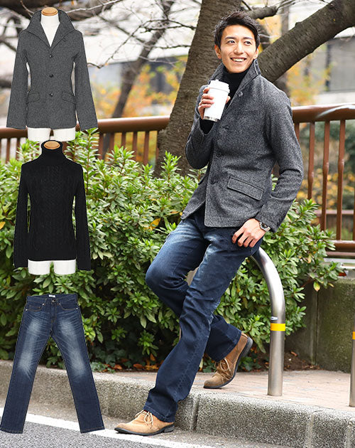 チャコールグレー長袖テーラードジャケット 黒タートルネックニット ネイビーテーパードデニムパンツ ベージュチャッカブーツ snp_pg0431