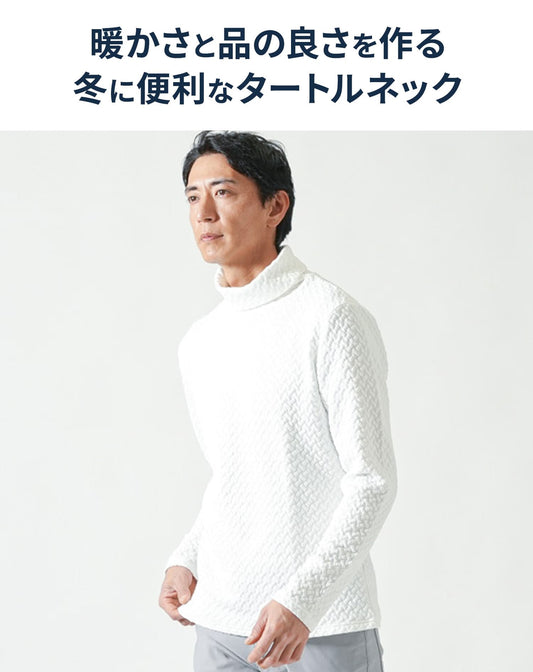 40代メンズ3点コーデセット グレンチェックロングコート×白タートルネックニット×黒スリムチノパンツ