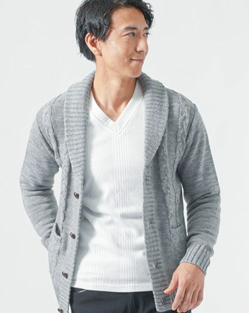 がっちり体型の方におすすめ冬の4点コーデセット グレースタンドカラーロングコート×黒ニットアウター×白長袖Tシャツ×ネイビーデニムパンツ