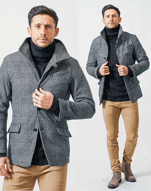 がっちり体型の方におすすめ冬の3点コーデセット グレンチェックメルトンジャケット×黒タートルネックニット×ベージュスリムチノパンツ