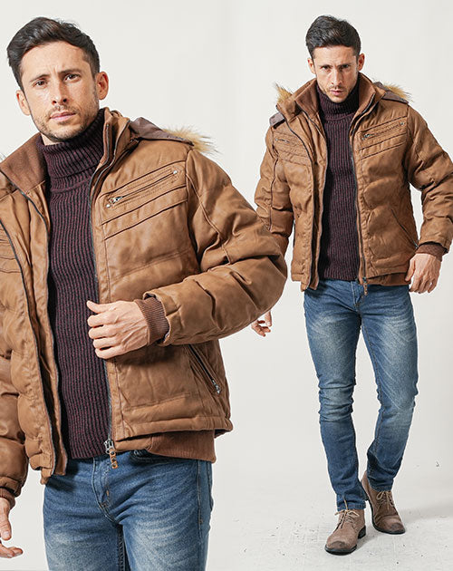 湿式PUレザーファーフード付き中綿ダウンジャケット