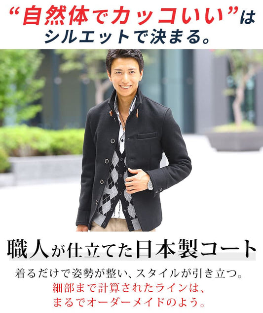 日本製レザーベルト付きショート丈メルトンイタリアンスタンドコート