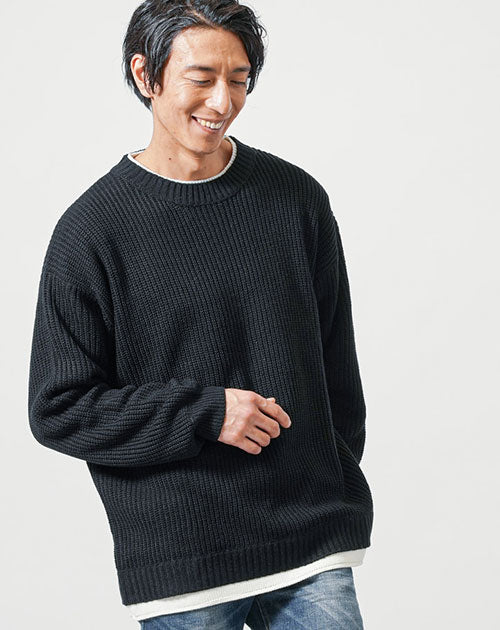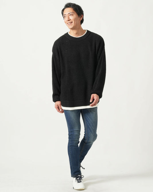 フェイクレイヤードオーバーサイズ長袖クルーネックニットTシャツ
