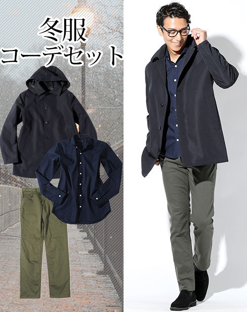 冬服ファッションメンズ3点コーデセット ネイビーフード付きステンカラーコート×ネイビー長袖シャツ×カーキストレッチスリムチノパン biz
