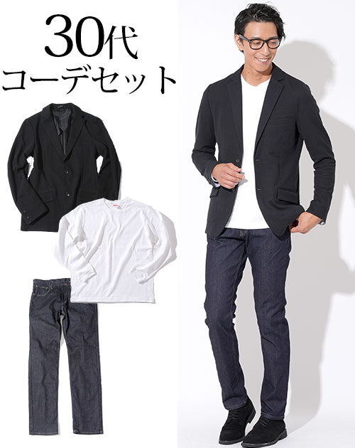 30代メンズ3点コーデセット 黒ストレッチジャケット×白厚手長袖Tシャツ×スリムデニムパンツ biz