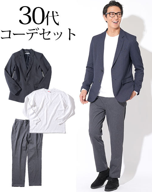30代メンズ3点コーデセット ネイビーテーラードジャケット×白長袖Tシャツ×チャコールグレーテーパードスラックス biz