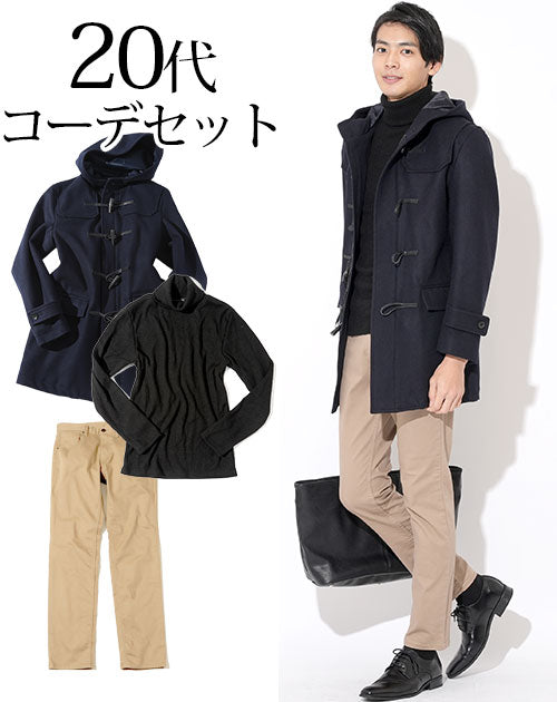 20代メンズ3点コーデセット ネイビーダッフルコート×黒タートルネックニット×ベージュスリムパンツ biz