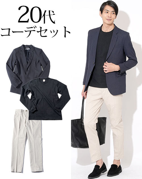 20代メンズ3点コーデセット ネイビーテーラードジャケット×黒長袖Tシャツ×オフホワイトテーパードスラックス biz