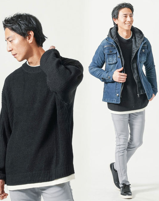 オーバーサイズフェイクレイヤード長袖クルーネックニットTシャツ
