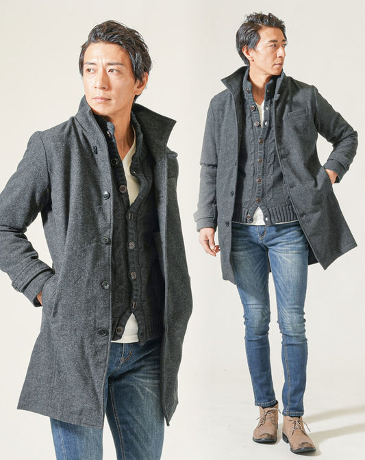 40代メンズ冬服3点コーデセット メルトンロングコート×黒スタンドニットアウター×ネイビーストレッチデニムパンツ