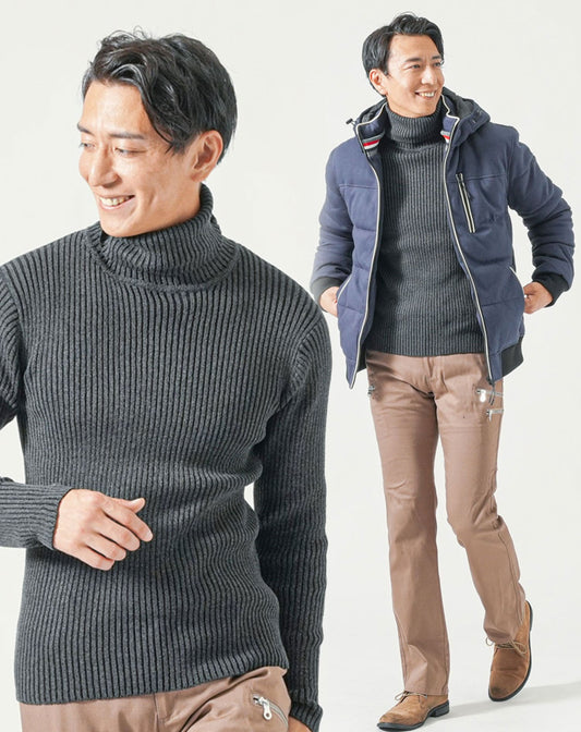 50代メンズ冬服全身3点コーデセット ネイビー中綿ダウンジャケット×チャコールグレータートルネックニット×ベージュブーツカットチノパンツ