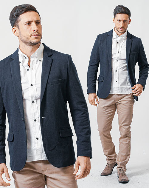 40代メンズ3点コーデセット ネイビーウォッシャブルテーラードジャケット×白長袖Tシャツ×グレーストレッチスリムチノパンツ biz