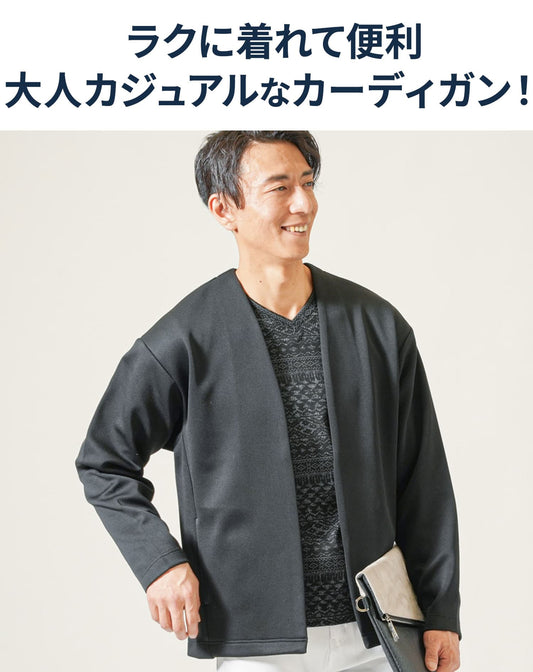 40代メンズ3点コーデセット 黒ショールカラーカーディガン×白イージーケア長袖シャツ×ネイビーウィンドペンチェックパンツ biz