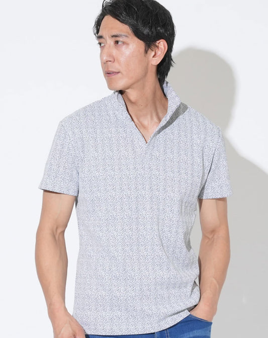 ラフヘリンボーン柄イタリアンカラー半袖ポロシャツ