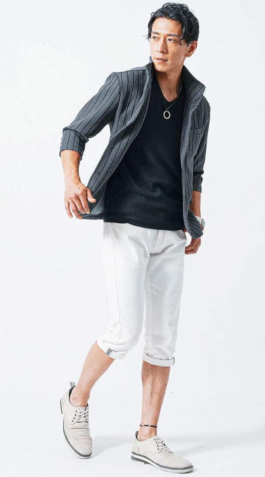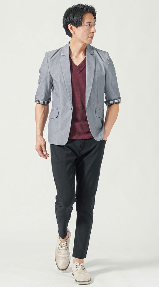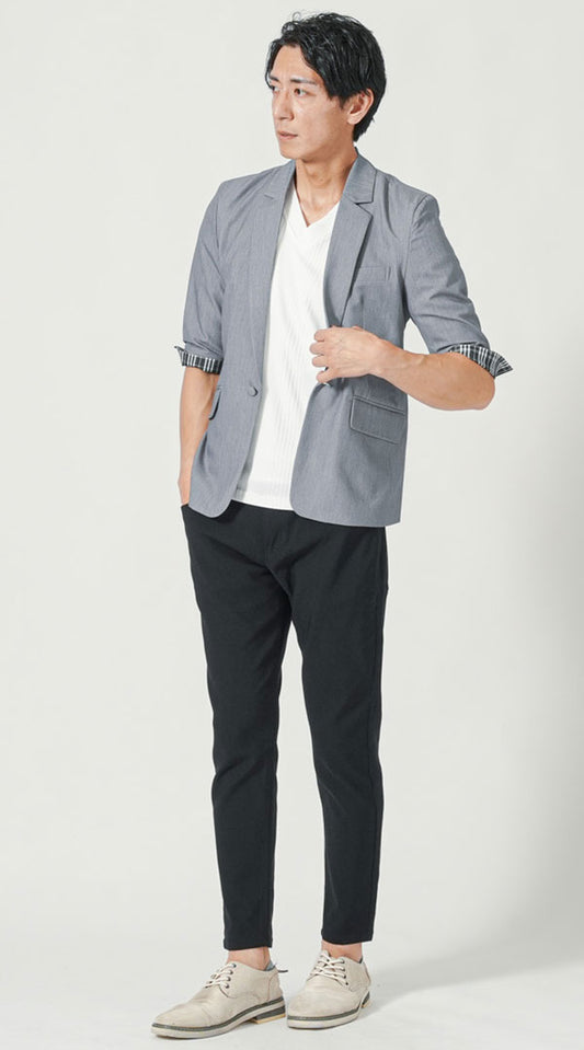 チャコールグレーテーラードジャケット×白長袖Tシャツ×黒テーパードスラックスチノパン biz22aw_0770