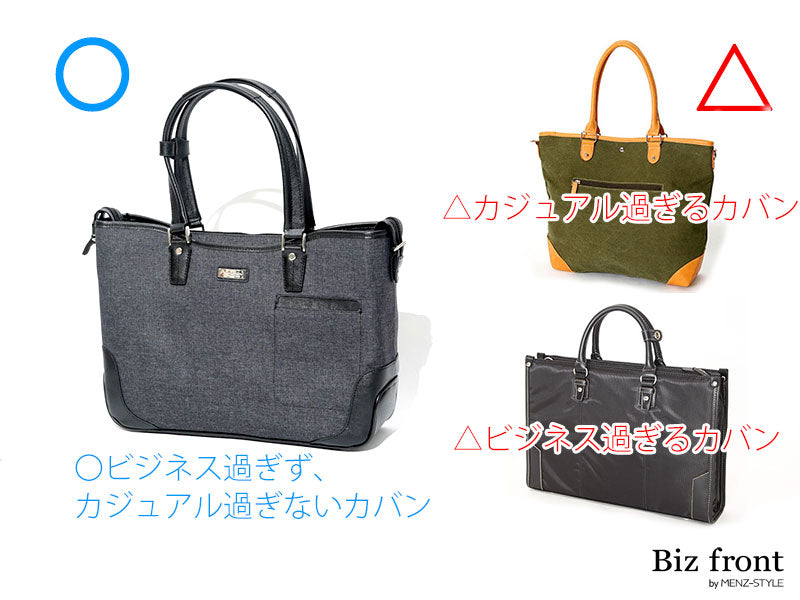 ・おすすめは「きれいめトートバッグ」や「クラッチバッグ」。カジュアル過ぎず、ビジネス一辺倒でもない中間のデザインが最適です。