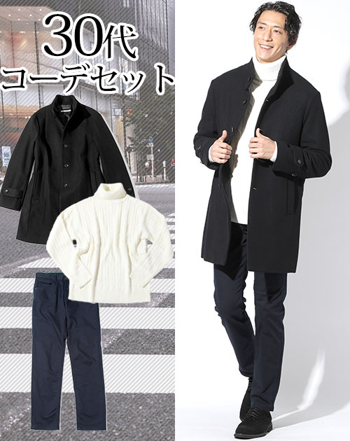 30代メンズ3点コーデセット 黒スタンドカラーコート×白タートルネックニットセーター×ネイビースリムストレッチチノパン