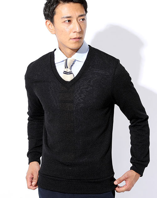 Vネックは、ビジネスニットの定番中の定番。首元が開くことでネクタイがきれいに見え、全体をすっきりとした印象に整えてくれます。特にグレーのスーツに黒やネイビーのVネックを合わせると、「誠実で信頼できる」印象を演出できます。