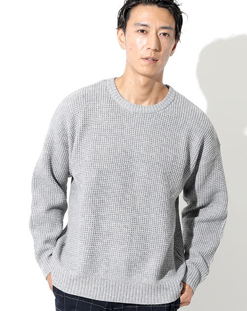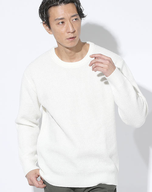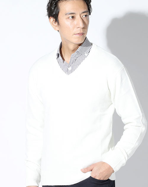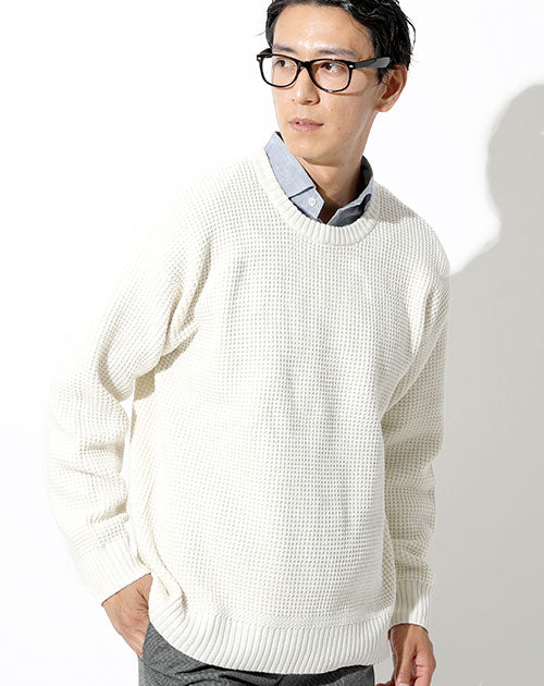 また、白はシンプルだからこそ素材感やシルエットが重要。ハイゲージのVネックなら知的でキレイめに、ワッフルやローゲージの丸首ならリラックス感のあるおしゃれカジュアルに。季節感を出したい秋冬シーズンにはオフホワイトの温かみある色味が最適です。