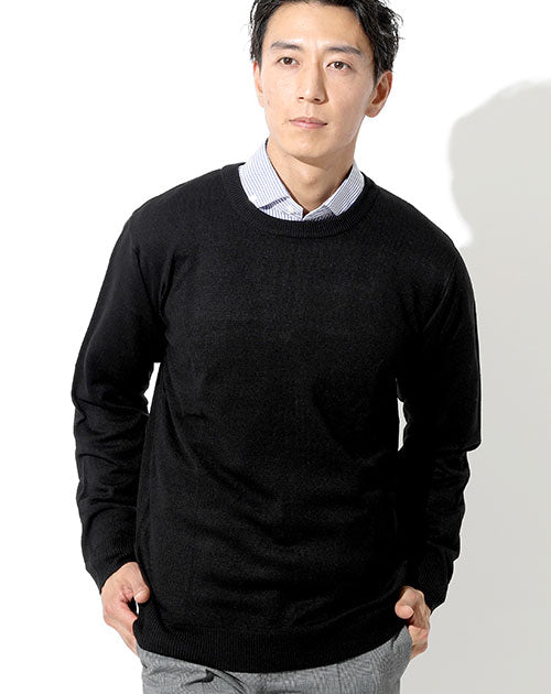 丸首(クルーネック)は、親しみやすく清潔感を与える万能アイテムです。スーツのようなかっちり感がないため、ジャケパンや私服通勤にぴったり。シャツの襟を少し覗かせると、ほどよく「きちんと感×抜け感」の両立が叶います。