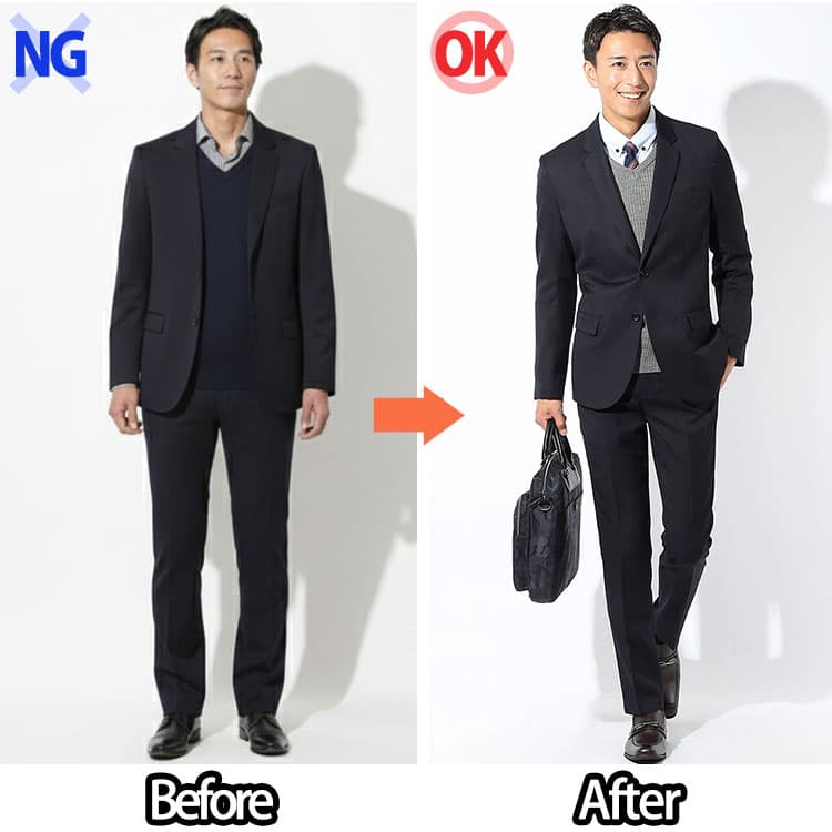 実際、NG例のネイビースーツのインナーのセーターをグレーに変えるだけで、印象はここまで変わります。