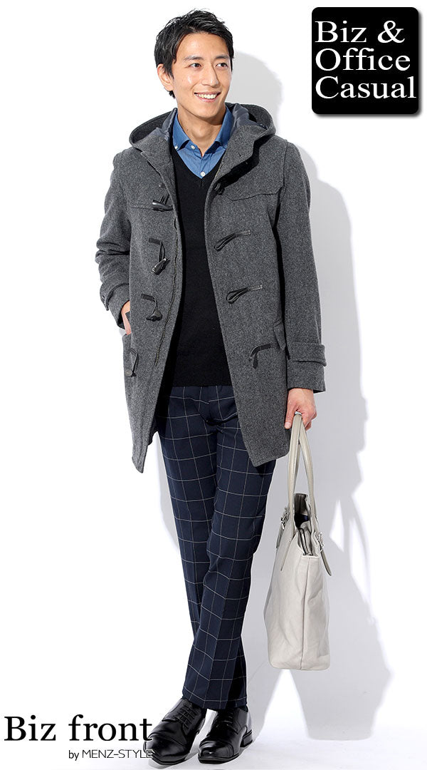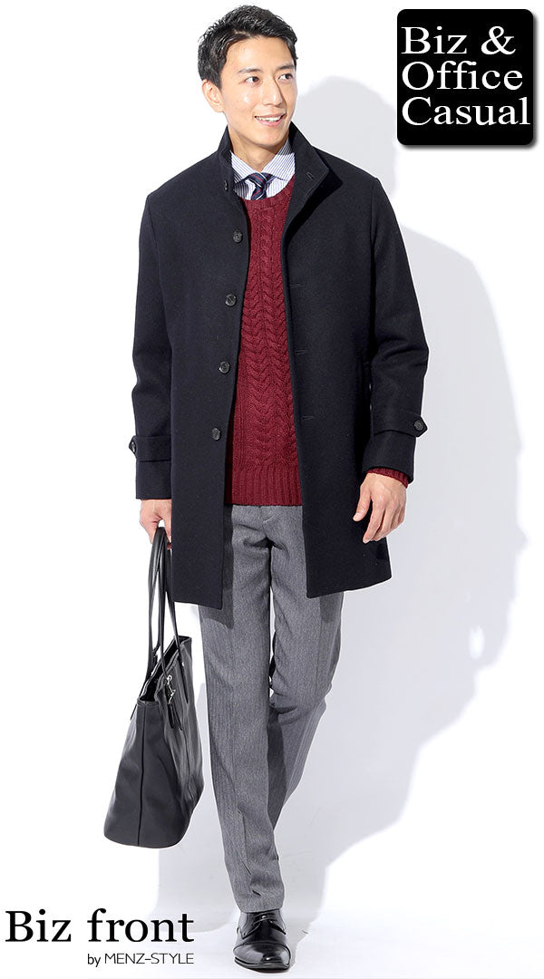 丸首ニットは、アウターとの組み合わせ次第で印象が変化します。チェスターコートやスタンドカラーコートと合わせると、カジュアルながらも品のあるオフィススタイルが完成します。