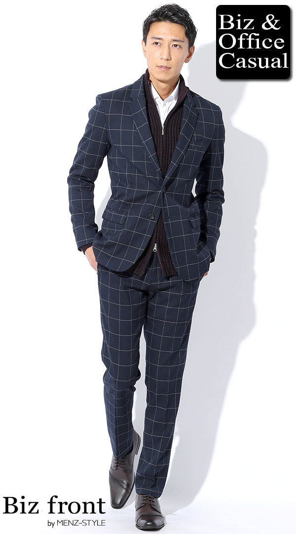 特に人気なのがウィンドペン柄やグレンチェック柄など、線が細くて落ち着いた印象のパターン。ネイビーやグレーのベースカラーなら、フォーマル感を残しつつ上品に見せられます。チェック柄が入るだけで、同じジャケットスタイルでも一段と洗練された印象になります。