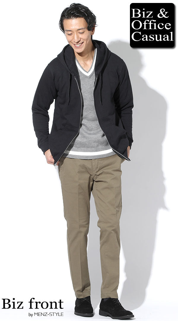 黒のビジネスセーターで引き締めるジャケパンスタイル