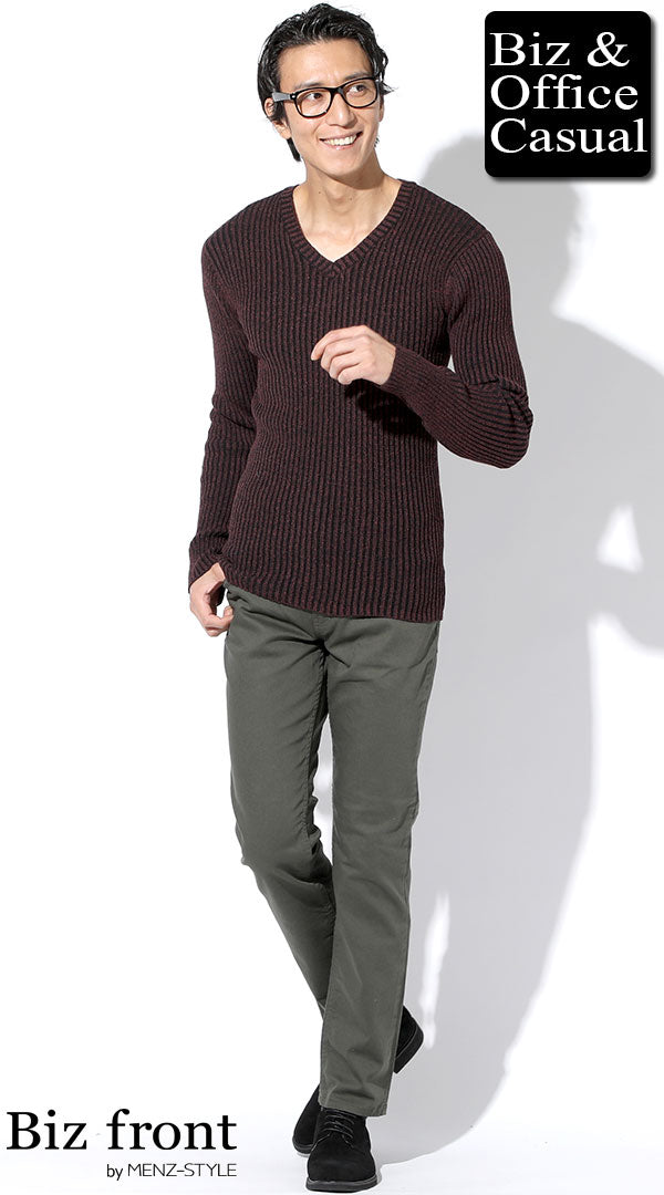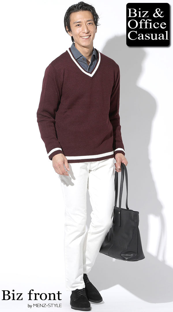 ワインレッドVネックセーターで魅せる華やぎビジネスカジュアル
