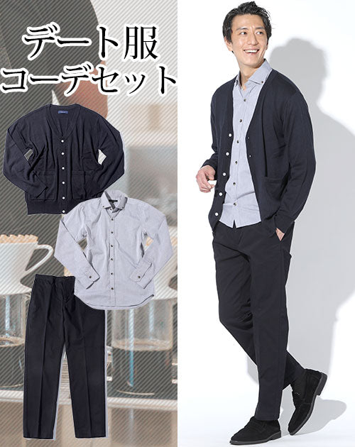 ネイビーシャツ×カーディガンのコーデ例を見ていきましょう。ネイビーシャツは深い色合いで男らしいアイテムです。全体が暗くなりすぎないようなカーディガンを選びましょう。