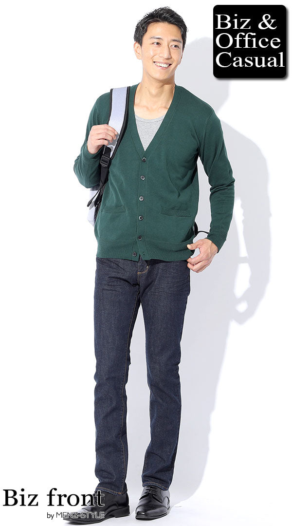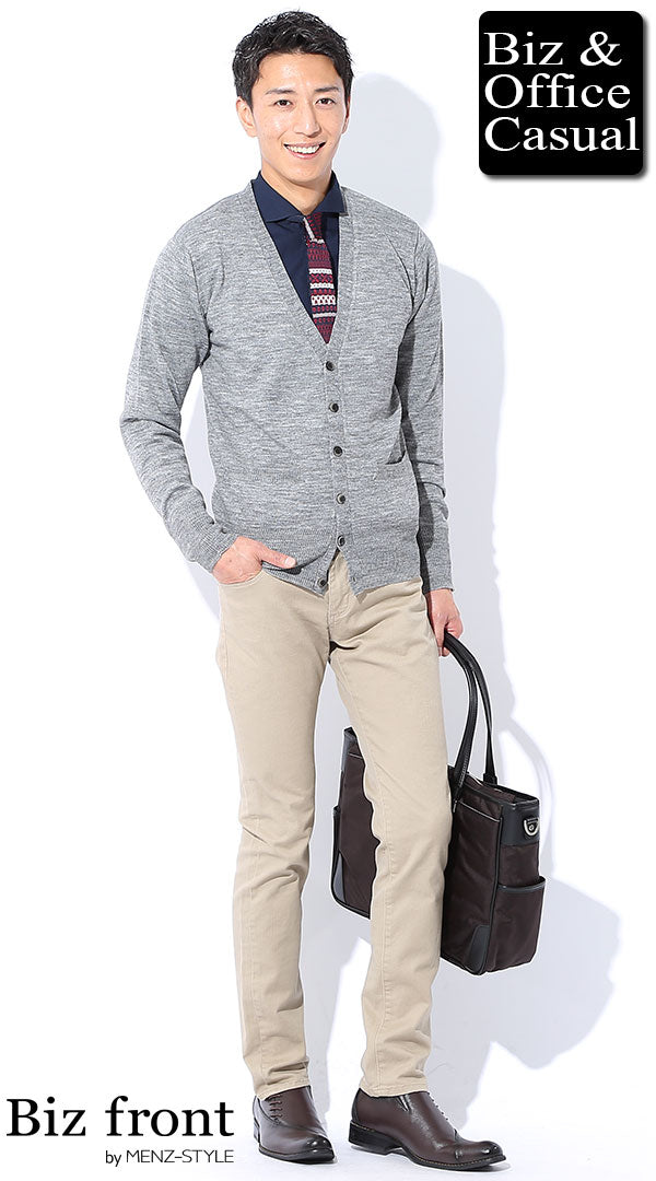 シャツにカーディガンを羽織った重ね着スタイルは、カジュアルだけでなくビジネスシーンにも使える幅の広いコーディネートです。