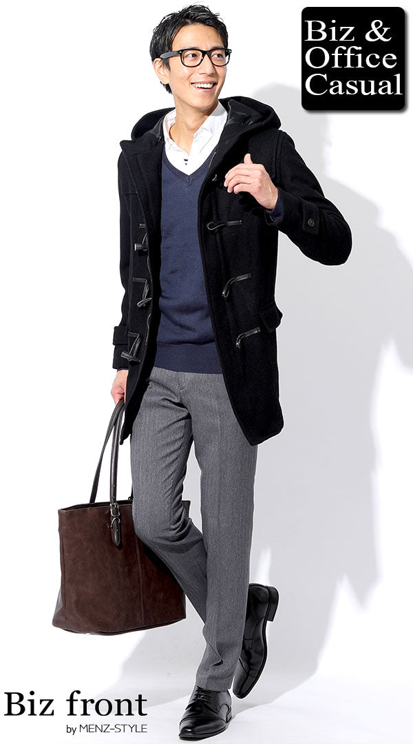 黒のダッフルコートで知的な印象を出し、インナーはネイビーのニットとホワイトシャツで爽やかに。襟元を白で明るくし、重たくなりすぎないモノトーン+有彩色のコーディネートです。秋冬のビジネスでもカジュアルでも使えるファッションコーデ例|黒ダッフルコート×ネイビーニットセーター×白シャツ×グレースラックス ノーネクタイスタイル