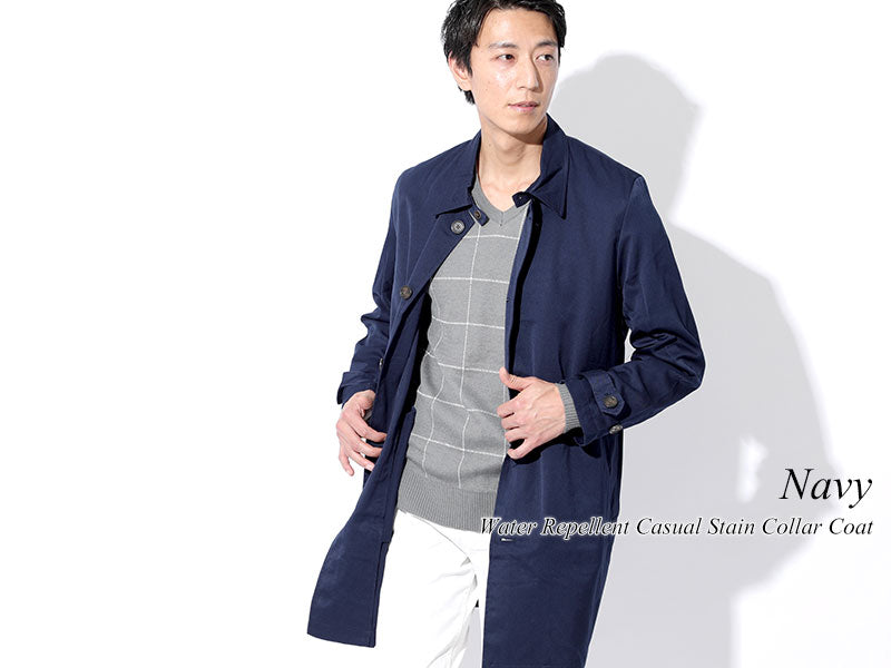 春や秋に着やすい薄手のロングステンカラーコート。サラッとした表面生地は撥水加工で軽い雨なら難なく対応。特殊加工で柔らかい質感を保っています。いつもはテーラードジャケットのようなカチッとしたスタイルなら、ショップコートのようなハイセンスさを感じさせるカジュアルステンカラーコートでイメージチェンジしてみませんか?