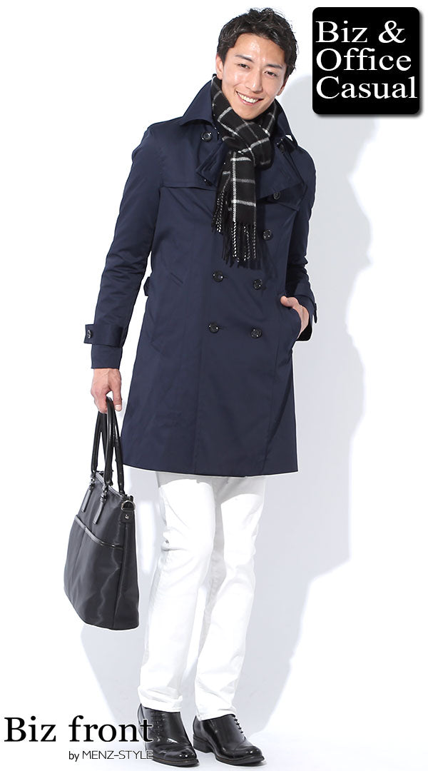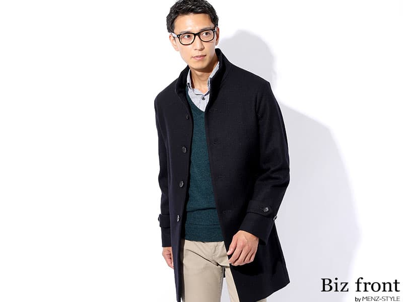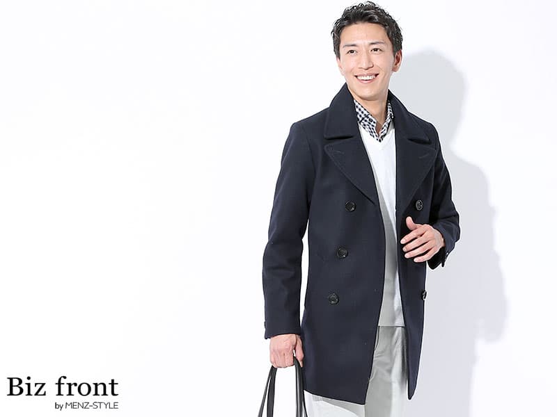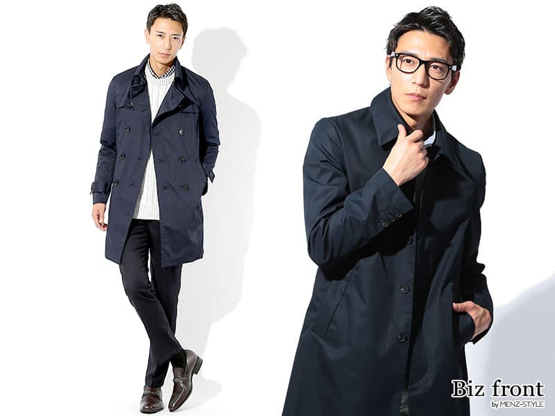 ネイビーコートは収縮色でスリムに見え、ビジネスにもカジュアルにも使えるデザインが多いアイテムです。