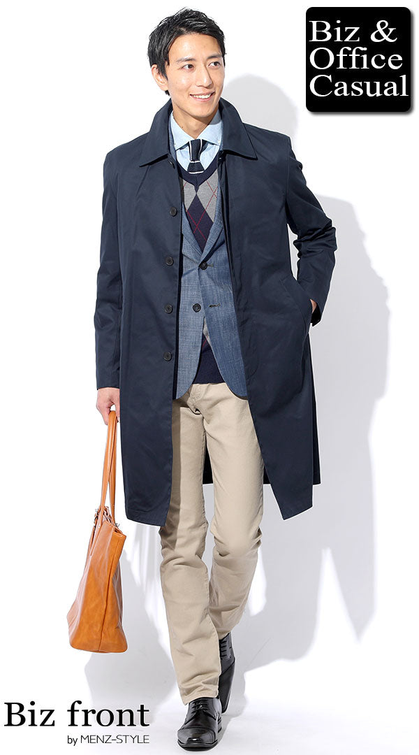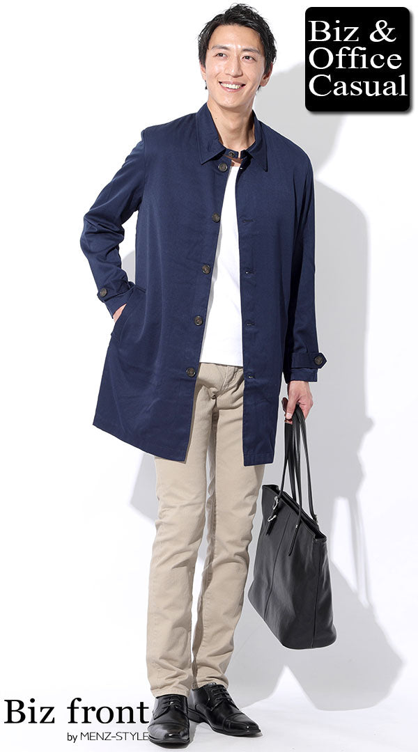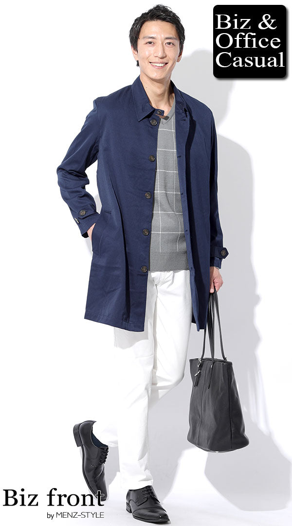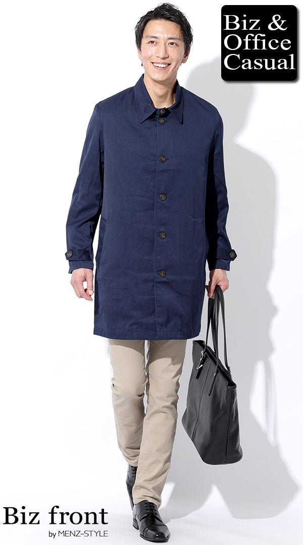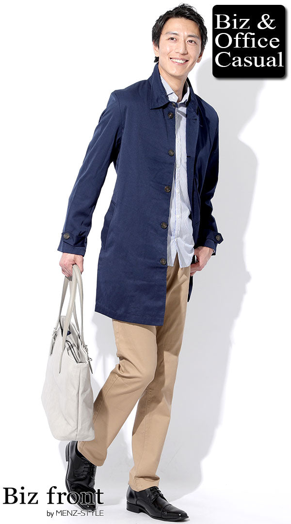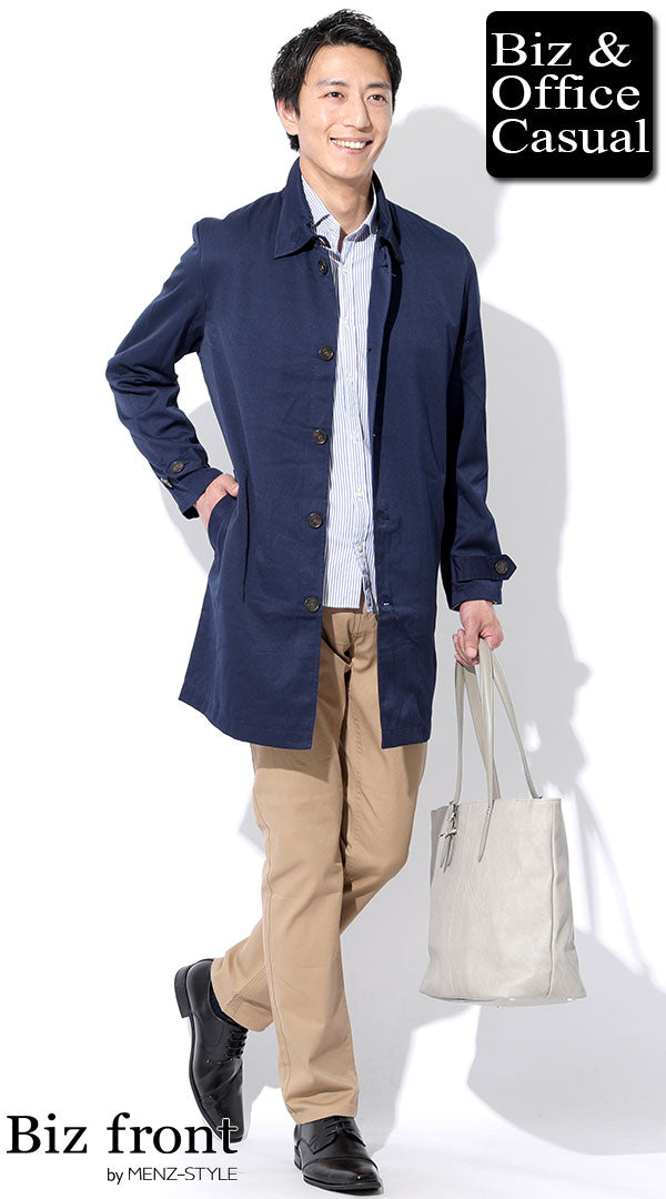 春や秋のネイビーコートはトレンチコート、ステンカラーコートなど、防風・防塵の薄手のコートが最適です。