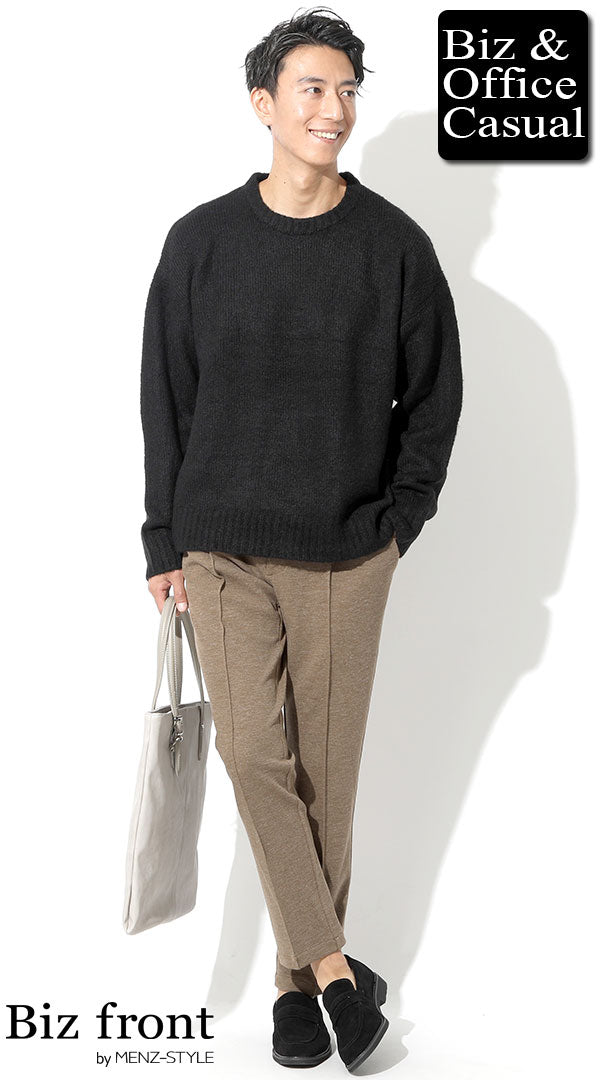 黒のビッグシルエットニットとベージュパンツのカジュアルな組み合わせ。靴もニットに合わせて黒。鞄も全体になじむグレーを合わせています。冬服のメンズファッションコーデ例|黒丸首ニット×ベージュパンツ