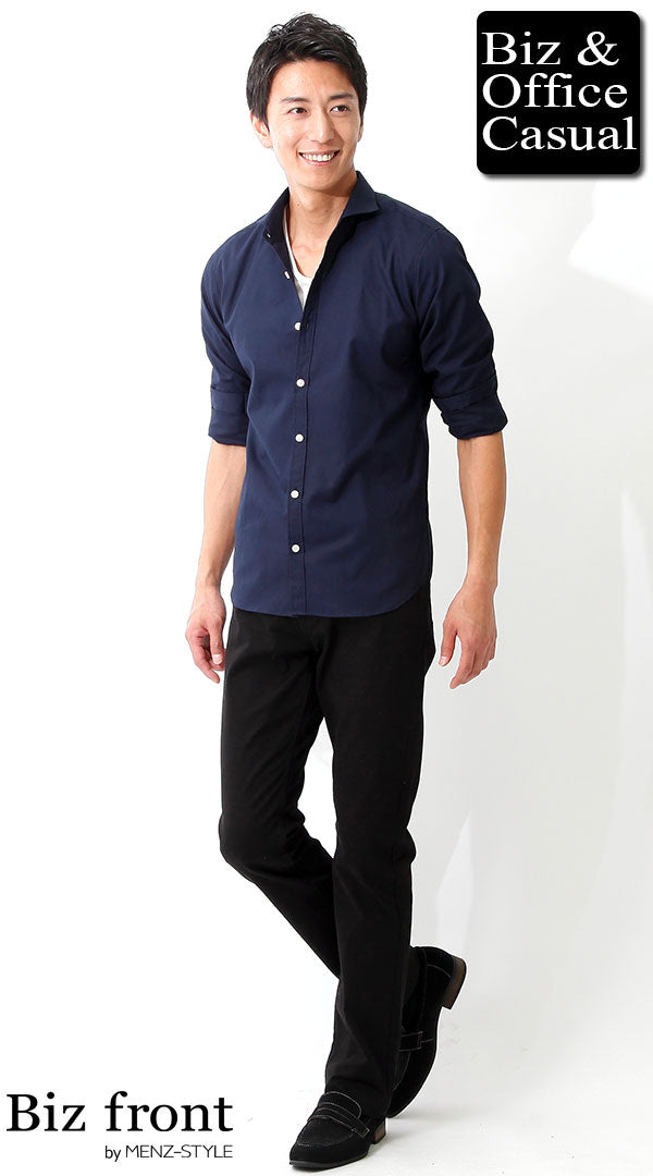 ネイビーシャツと黒パンツ、カットソーのカジュアルスタイル。服装自由の会社でのカジュアルな通勤服です。カジュアルな服でも仕事を邪魔しないシンプルな服装を選び、かつセンスを感じさせる雰囲気を作り出すコーディネートは周りの人にも仕事が出来る男の印象を与えます。腕まくりの着こなしが男らしさや頼もしさも伝えますね。シンプルファッション・シンプルコーデ例|ネイビーシャツ×ブラックスキニーパンツ×ホワイトカットソー 腕まくり