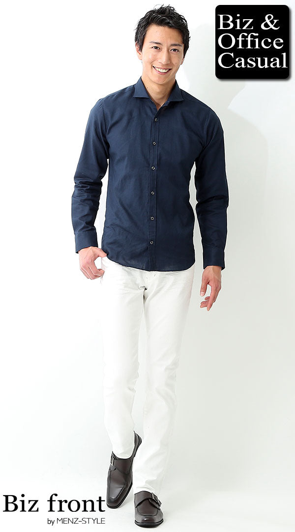 白シャツとネイビースラックスのシンプルなオフィスカジュアル。パンツインも出来る着丈のビジネスカジュアルシャツはカジュアルな着こなしも可能です。シンプルで女性からの好感度の高いスタイルです。シンプルファッション・シンプルコーデ例|ホワイトビジネスカジュアルシャツ×ネイビースラックス