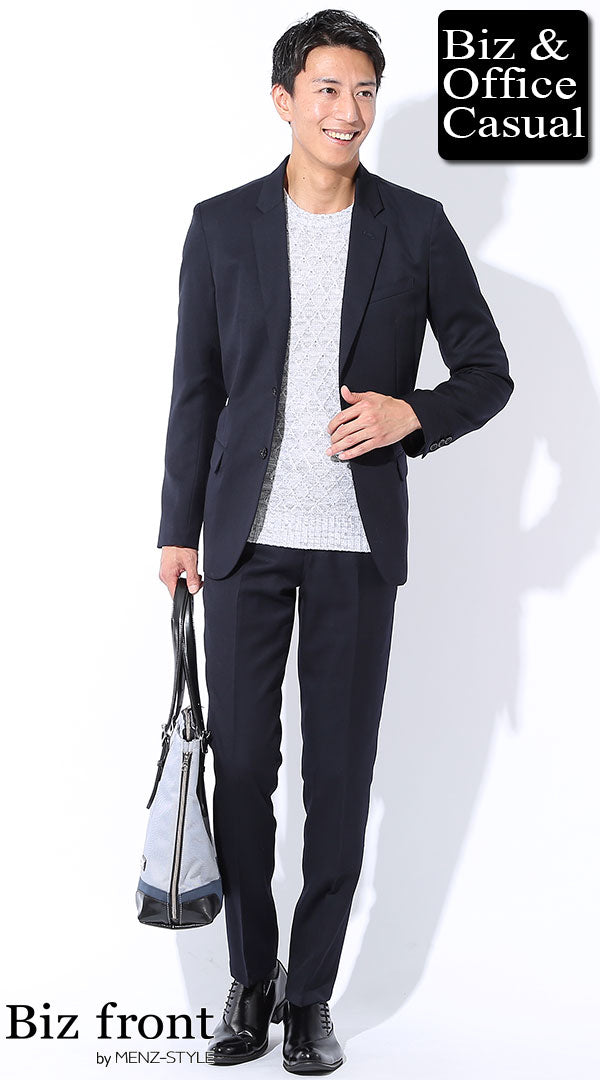 ネイビーのスーツにインナーはグレーのニットセーターで合わせて明るさを取り入れたビジネスカジュアルコーディネート。グレーのニットが爽やかですね。シンプルファッション・シンプルコーデ例|ネイビースーツ×グレーセーター