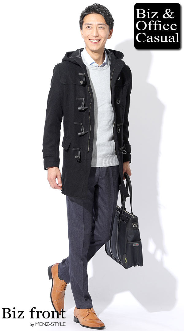 淡いグレーとブルーのシャツに、メリハリのある黒のダッフルコートを合わせたカジュアルスタイル。ダッフルコートには知的な雰囲気もあり、丸首の行儀のよい清潔感あるスタイルとよく合いますね。シンプルファッション・シンプルコーデ例|黒ダッフルコート×グレー丸首ニットセーター