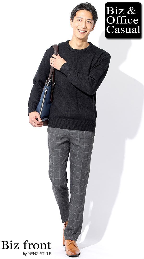 グレーのチェックパンツに黒の丸首ニットセーターを合わせたシンプルモノトーンコーディネート。丸首は上半身を大きくゆったりした雰囲気に見せることが出来ます。シンプルファッション・シンプルコーデ例|黒丸首ニットセーター×グレーチェックパンツ