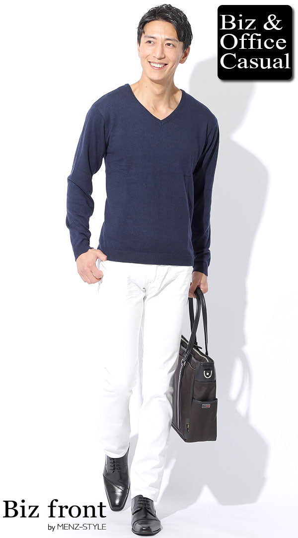 爽やかなネイビーのVネックニットを1枚で白パンツと合わせたシンプルスタイル。インナーには長袖のカットソーなどと合わせると良いですね。ジャケットなどと合わせやすいスタイルで秋冬でも爽やかに見えるベースコーデです。シンプルファッション・シンプルコーデ例|Vネックネイビーニットセーター×ホワイトパンツ