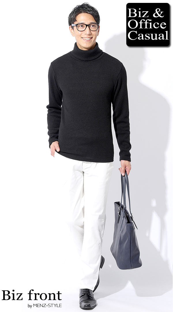 黒のタートルネックにホワイトパンツを合わせたシンプルなモノトーンスタイル。無駄のない、セクシーな雰囲気もある大人のシンプルスタイルです。シンプルファッション・シンプルコーデ例|黒タートルネックニット×白チノパン