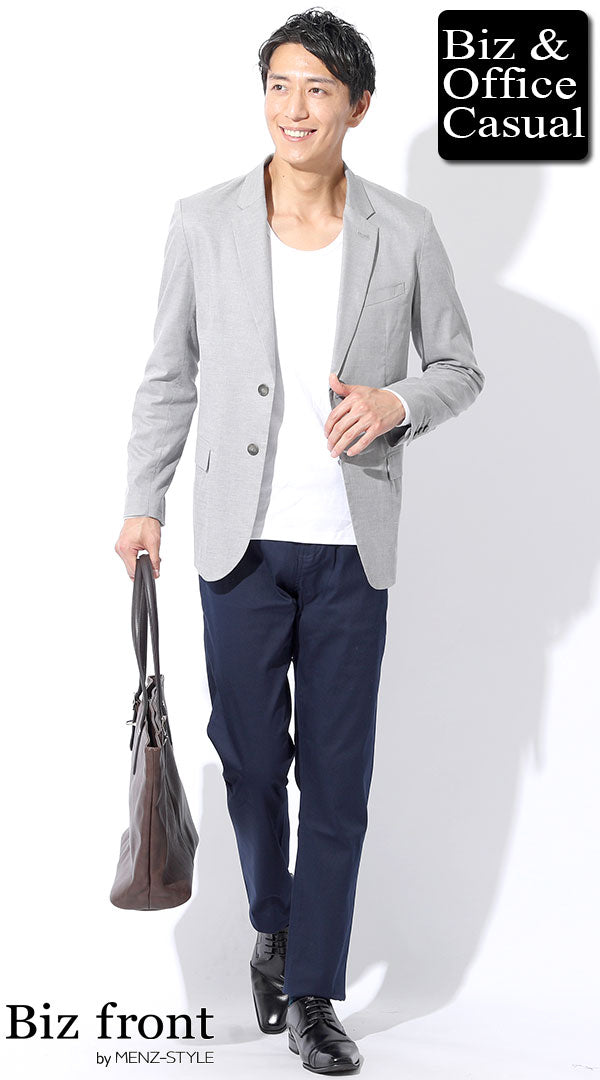 明るいライトグレーのテーラードジャケットに丸首カットソー、ネイビーのチノパンを合わせたカジュアルジャケパンスタイル。私服通勤スタイルとしても人気のジャケパンスタイルです。シンプルファッション・シンプルコーデ例|グレーテーラードジャケット×ホワイトカットソー×ネイビーパンツ