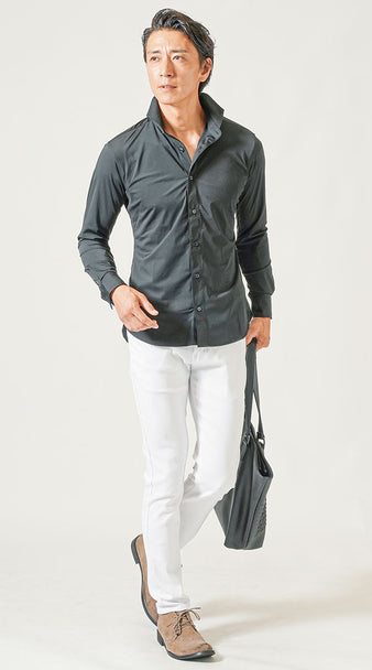 40代メンズ3点コーデセット グレー長袖スタンドカラージャケット×ネイビー日本製長袖シャツ×白スリムチノパンツ
