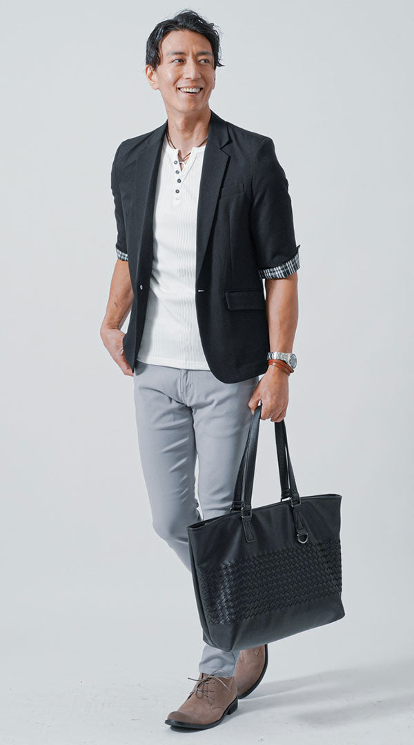 ちょいワル・イケオジメンズ3点コーデセット グレー7分袖ジャケット×白7分袖シャツ×黒スリムチノパンツ