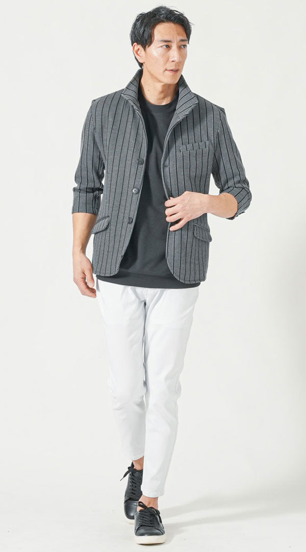 40代メンズ3点コーデセット グレースタンドカラージャケット×白長袖Tシャツ×黒スリムチノパンツ