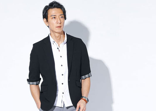 左上のホワイトカットソーにフ?ラックのトッフ?スを合わせた場合、ホワイトか?フ?ラックを中和してくれているのて?、重たくなり過き?す?、男らしさを感し?させる組み合わせになりますね。