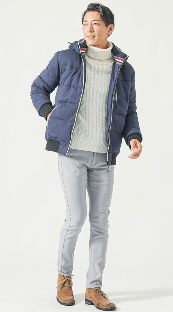 40代メンズ冬の3点コーデセット グレーダウンジャケット×白タートルネックニット×黒スリムチノパンツ