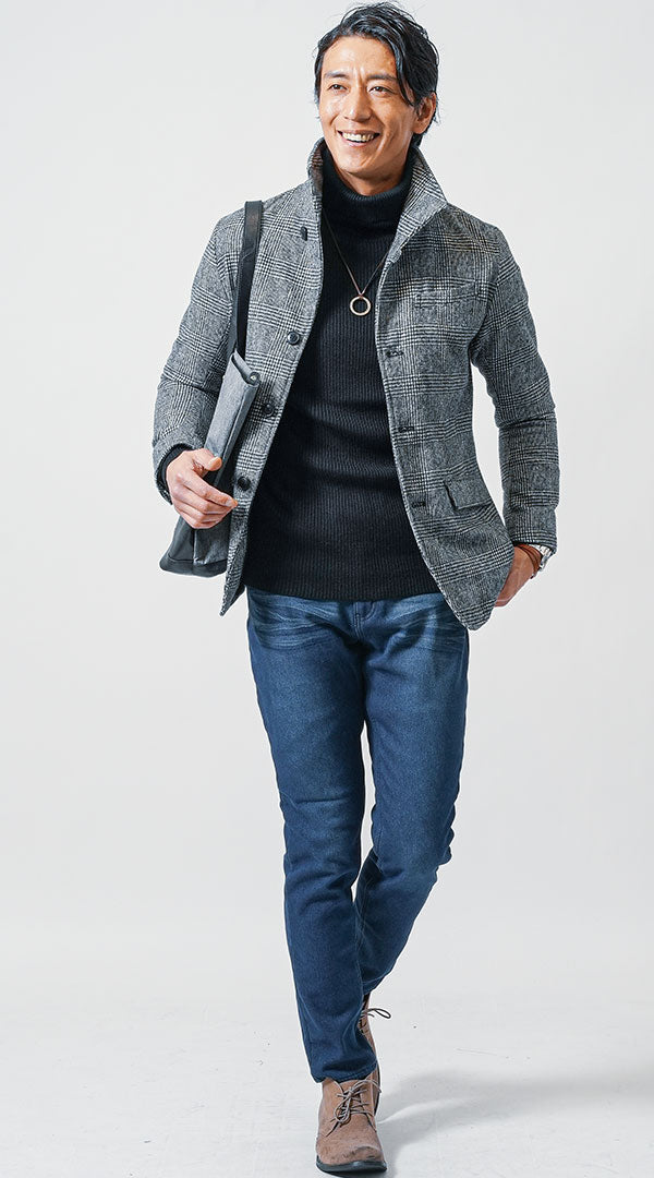 40代メンズ冬の3点コーデセット グレーツイードダウンジャケット×黒タートルネックニット×ネイビースリムデニムパンツ
